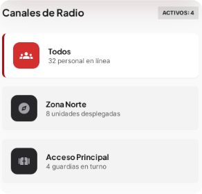 Aplicación móvil para clientes y personal. Visualización en tiempo real de cámaras, monitoreo de ubicación de cada guardia, supervisión remota 24/7, geolocalización del personal, control de cumplimiento de funciones, verificación de presencia en puntos críticos